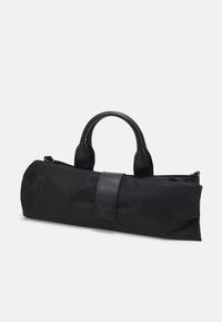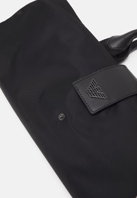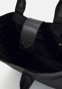Czarna torba na ramię z skórzanymi uchwytami, oznakowanym paskiem na ramię oraz przednią klapką z wytłoczonym logo, na jednolitym białym tle.