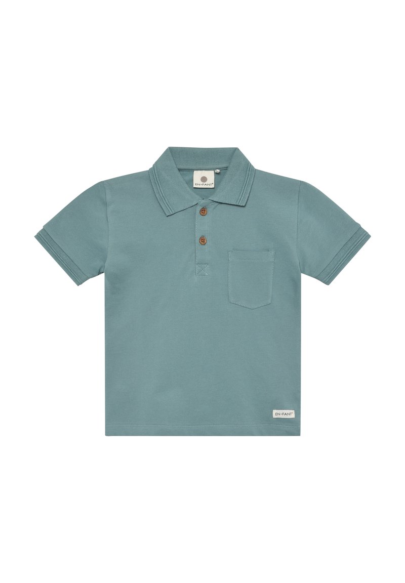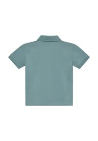 Koszulka polo z krótkim rękawem z miękkiej bawełny w odcieniu miękkiej zieleni, z kołnierzykiem, trzema brązowymi guzikami i pojedynczą kieszenią na piersi. Etykieta na brzegu.
