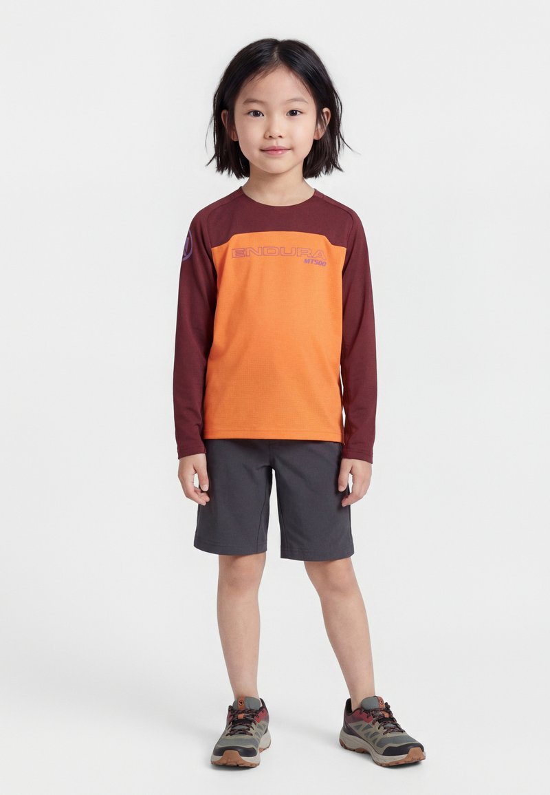 Dziecko z krótkimi czarnymi włosami, ubrane w pomarańczowo-bordową bluzę z długim rękawem, ciemne spodenki i szare buty trekkingowe, stojące na tle białego tła.