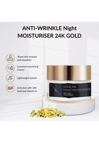 Zanurz się w luksusowej pielęgnacji nocnej z naszym Nawilżającym Kremem Przeciwzmarszczkowym na Noc 24k Gold, 50-mililitrowym preparatem stworzonym, aby odmłodzić i zregenerować Twoją skórę podczas snu. Wzbogacony czystym 24-karatowym złotem, ten krem nawilżający na noc pomaga stymulować produkcję kolagenu, zmniejszyć widoczność drobnych linii i zmarszczek oraz poprawić elastyczność skóry. Jego bogata, odżywcza formuła głęboko nawilża i rewitalizuje skórę, pozostawiając ją gładką, jędrną i promienną o poranku. Idealny dla osób, które chcą zwalczać oznaki starzenia i budzić się z młodzieńczą, promienną cerą.