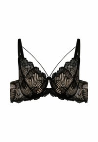 Czarny koronkowy biustonosz z kwiatowymi wzorami, skomplikowanymi detalami i przezroczystą siateczkową taśmą. Regulowane ramiączka uzupełniają design.