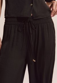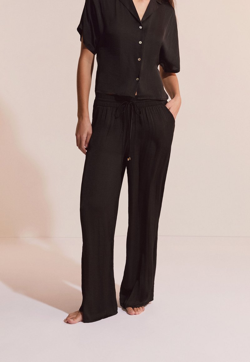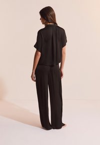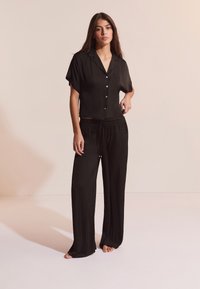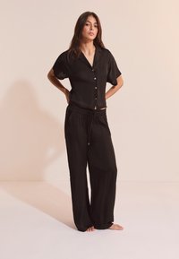 Kobieta ubrana w luźną czarną koszulę na guziki z krótkim rękawem oraz pasujące szerokie spodnie z troczkiem, stojąca boso na jednolitym tle.