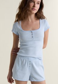 Młoda kobieta z rozpuszczonymi brązowymi włosami, ubrana w jasnoniebieski, prążkowany, krótki top z guzikami oraz pasujące spodnie, na jednolitym tle.