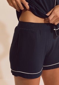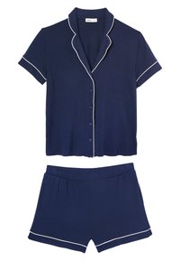 Kobieta o długich blond włosach, ubrana w granatowy krótki rękaw na guziki i pasujące szorty z białym obszyciem, stojąca z jedną ręką na biodrze.