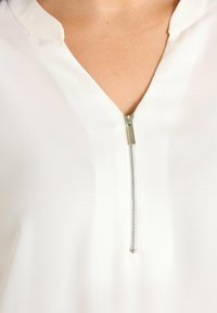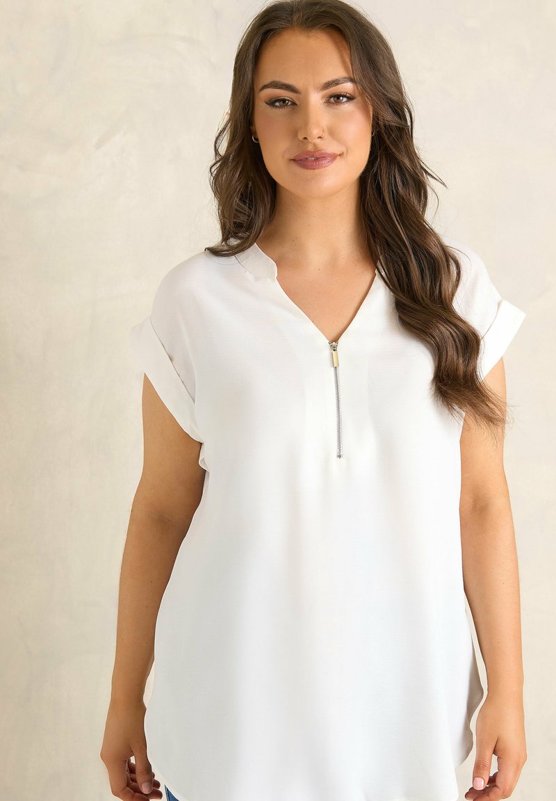 Kobieta o długich brązowych włosach nosi białą bluzkę z krótkimi podwiniętymi rękawami i przednim suwakiem na jednolitym beżowym tle.