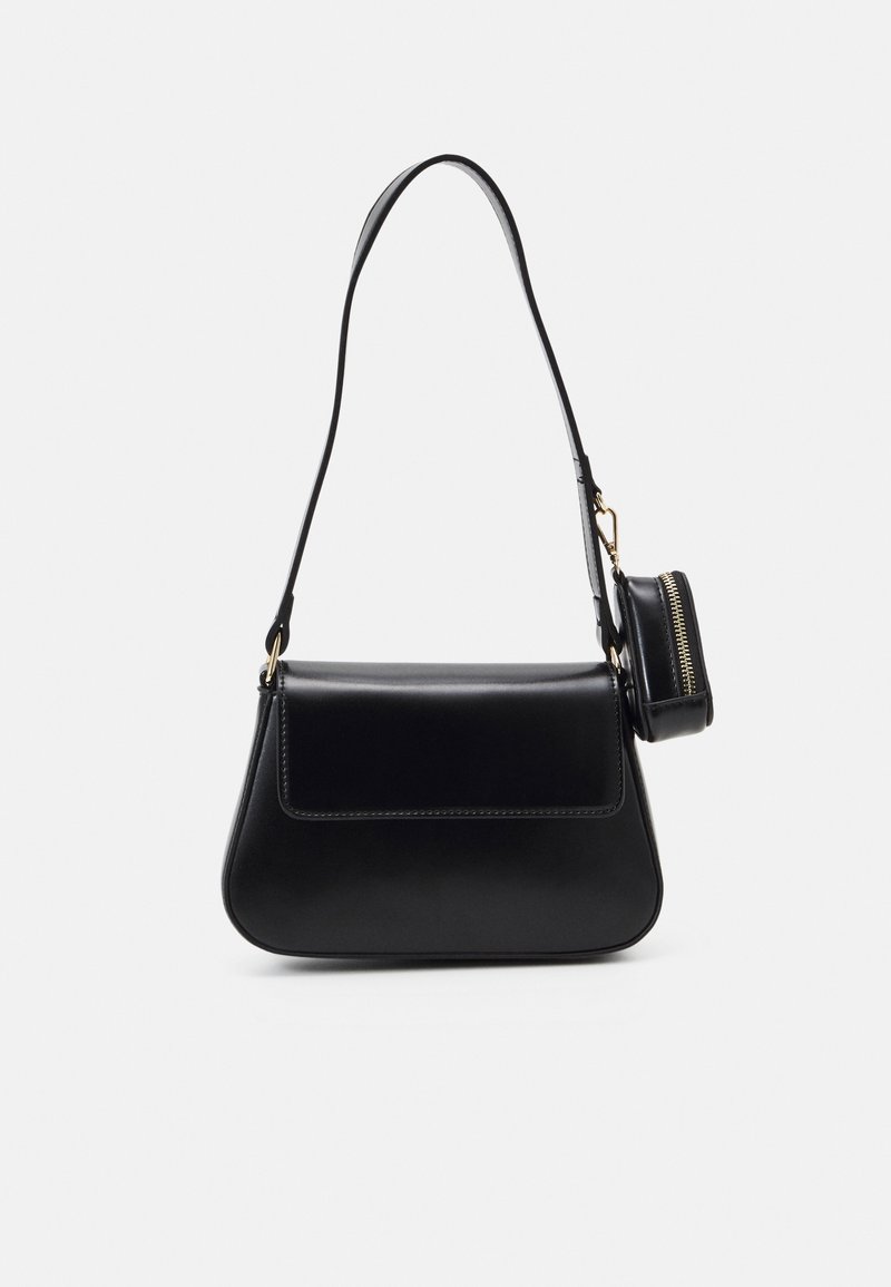 Czarna skórzana torebka o gładkim wykończeniu, trapezowym kształcie, z długim paskiem na ramię oraz małą kieszonką na zamek przymocowaną.