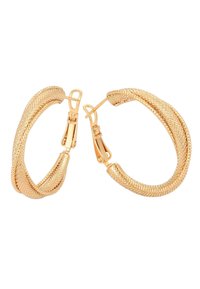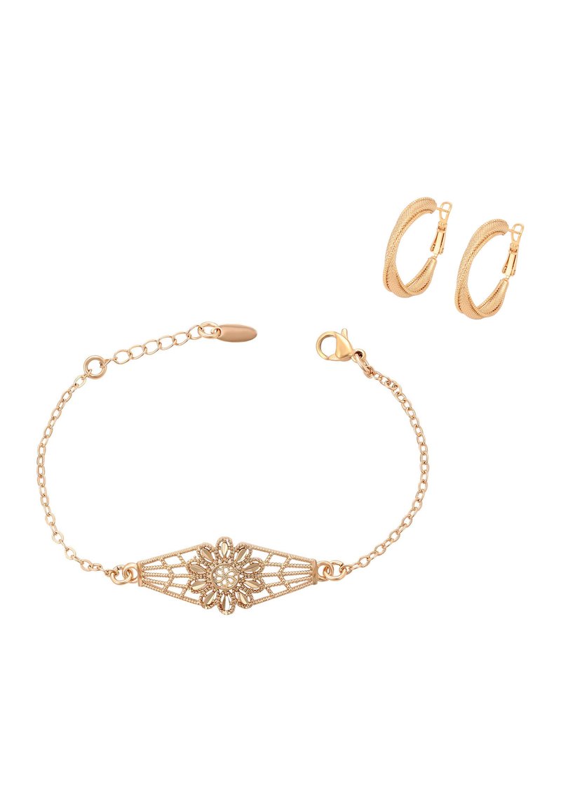 Bransoletka w kolorze złota z kwiatowym filigranowym elementem centralnym oraz dopasowane teksturowane kolczyki koła na białym tle.