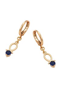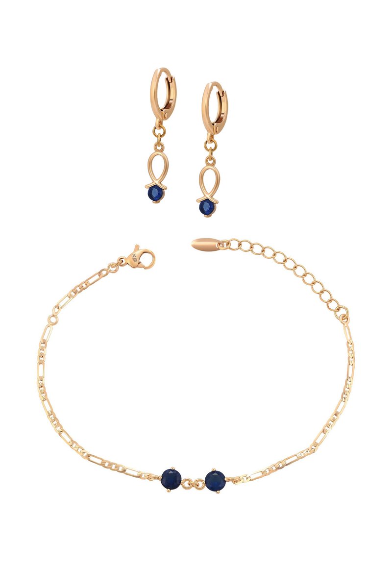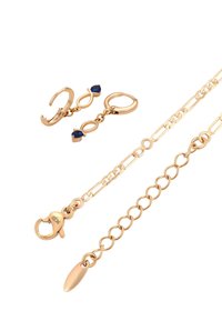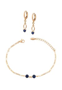 Złote kolczyki koła z zawieszkami w postaci pętli i niebieskich koralików, zestawione z delikatną złotą bransoletką z dwoma niebieskimi koralikami.