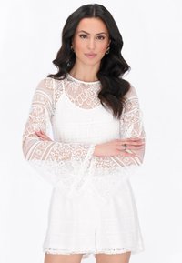 Kobieta o długich, ciemnych, falujących włosach, ubrana w biały koronkowy top z długim rękawem i szorty, stojąca ze skrzyżowanymi rękami na białym tle.