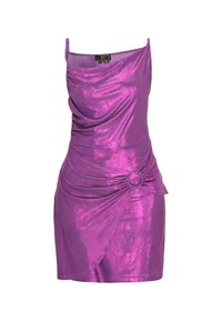 Kobieta z długimi brązowymi włosami, ubrana w błyszczącą, kremową, bezrękawnikową sukienkę z ozdobnym pierścieniem, pozująca z jedną ręką na głowie, a drugą na biodrze.