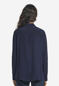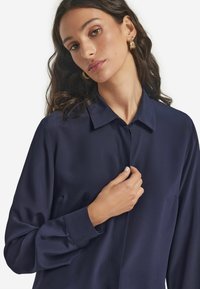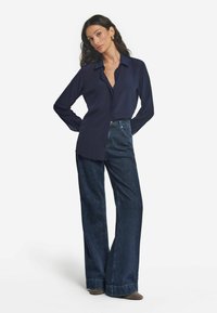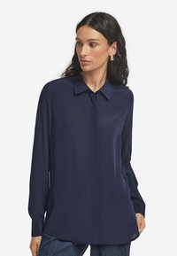 Kobieta o długich ciemnych włosach, ubrana w ciemnoniebieską bluzkę z długimi rękawami i kołnierzykiem, stoi na tle jednolitego białego tła.
