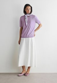 Kobieta o średniej długości ciemnych włosach, ubrana w jasnofioletową bluzkę z krótkim rękawem i białą spódnicę, stojąca na tle gładkiej białej ściany.