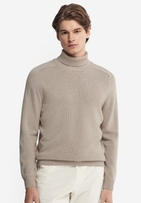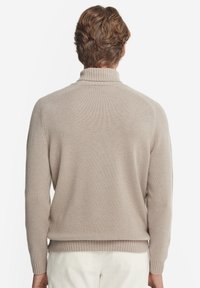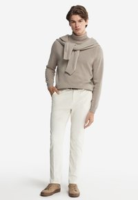 Młody mężczyzna w beżowym golfie i białych spodniach, stojący na jednolitym białym tle.