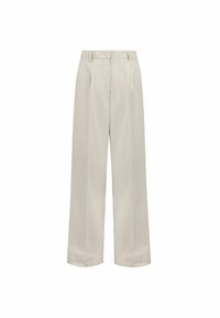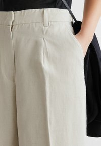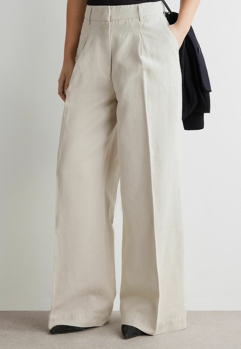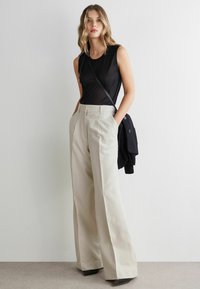 Kremowe spodnie o szerokich nogawkach z wysokim stanem i przednimi zakładkami, noszone z czarnymi butami i czarnym swetrem zarzuconym na ramię.
