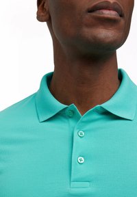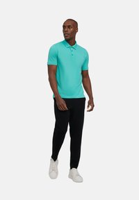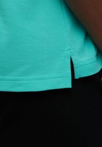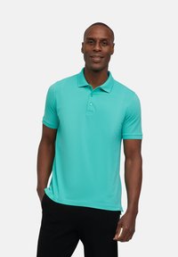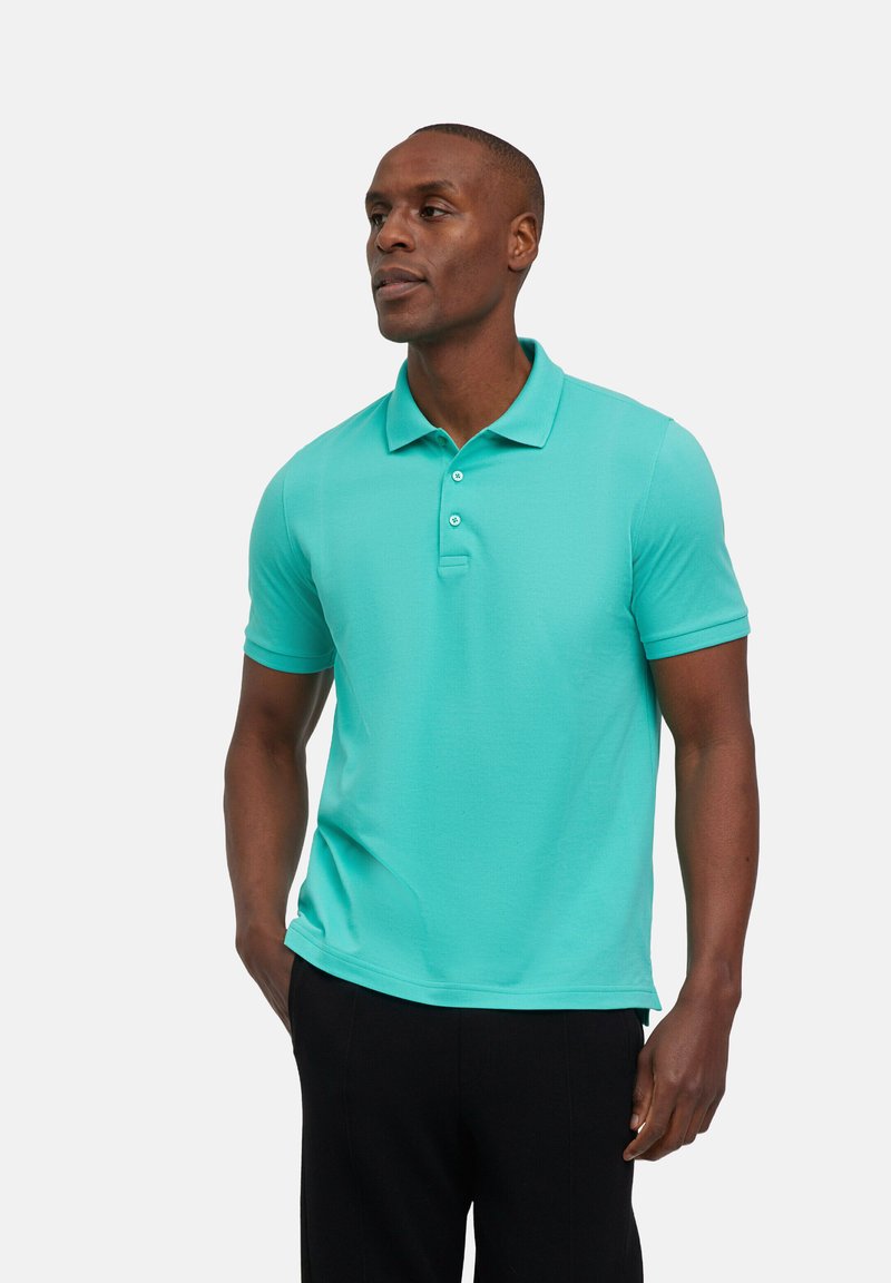 Turkusowa koszulka polo z krótkim rękawem, z trzema guzikami oraz gładką teksturą, połączona z ciemnymi spodniami. Brak wzorów lub akcentów.