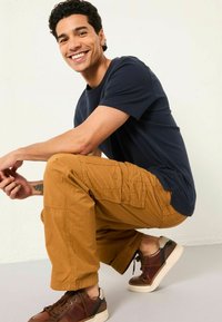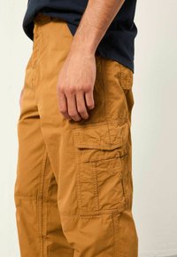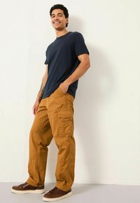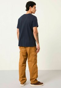 Spodnie cargo w ciepłym odcieniu brązu, wykonane z wytrzymałego materiału. Posiadają liczne kieszenie oraz luźny krój dla wygody i funkcjonalności.