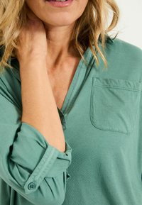 Jasnozielona koszula henley z długim rękawem i trzema guzikami, o luźnym kroju i podwiniętych rękawach, zestawiona z ciemnoniebieskimi dżinsami o szerokich nogawkach.