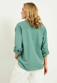 Turkusowa koszula z długim rękawem i kieszenią, w połączeniu z białymi szerokimi spodniami i beżowymi baletkami; na neutralnym tle.