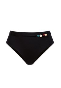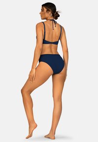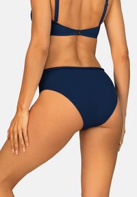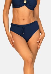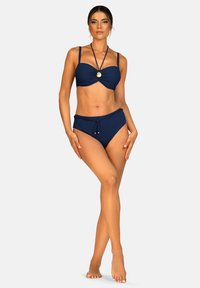 Kobieta ubrana w granatowe bikini z wysokim stanem, z paskiem z liny oraz dopasowany top z centralną złotą muszlą, stojąca z rękami wzdłuż ciała.