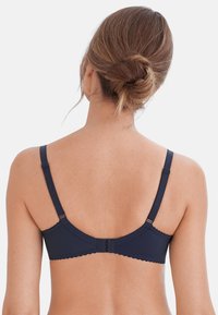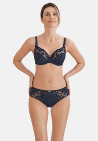 Kobieta o jasnobrązowych włosach, ubrana w granatowy stanik z koronki i w kropki, stoi na tle jednolitego, białego tła.