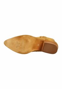Zamszowy botek w kolorze koniakowym z drewnianym obcasem typu słupek, ozdobnym przeszyciem, pętelką do ściągania oraz logo motyla z tyłu.