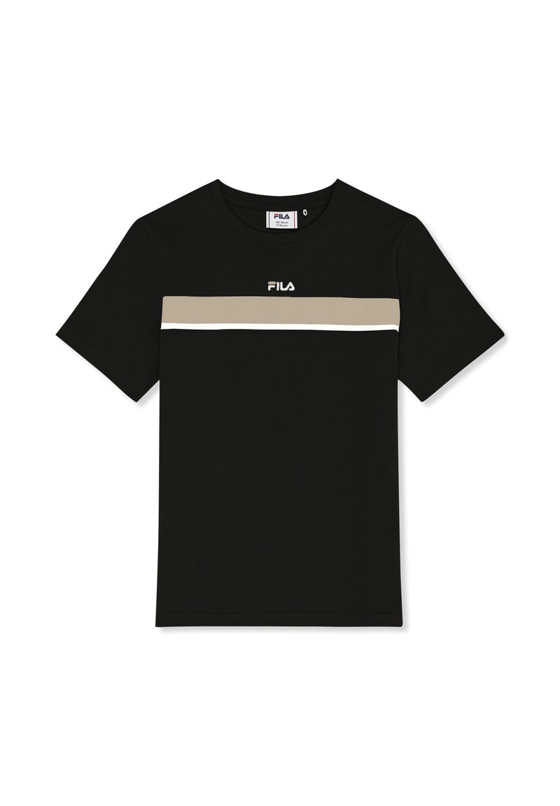 Czarny T-shirt z krótkim rękawem, z beżowo-białymi poziomymi paskami na wysokości klatki piersiowej oraz białym logo FILA nad paskami.