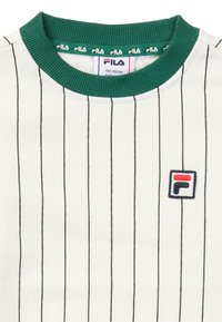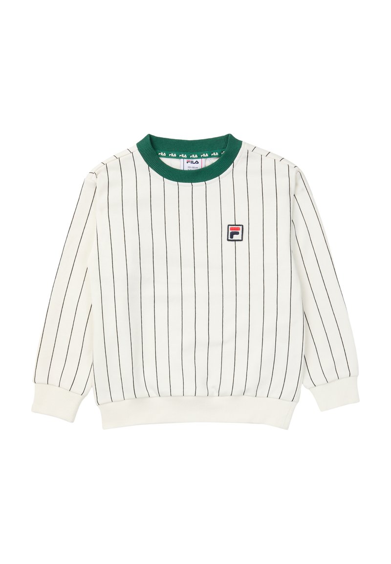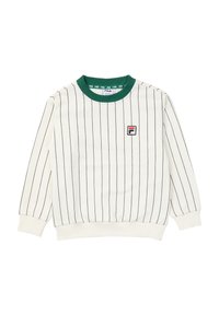 Biała bluza z długim rękawem z cienkimi czarnymi pionowymi paskami, zielonym prążkowanym kołnierzem, naszywką z logo FILA na piersi oraz białymi mankietami i dolnym obszyciem.
