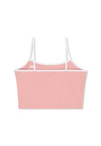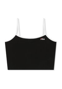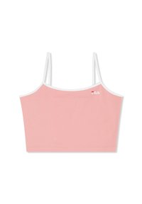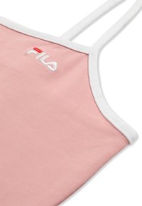 Różowy krótki top na ramiączkach z białą lamówką i cienkimi białymi ramiączkami, z małym logo FILA na górnej lewej stronie.