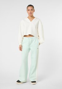 Kobieta z włosami związanymi do tyłu, ubrana w biały krótki kaptur i jasne miętowe spodnie z troczkiem, stojąca na jednolitym tle.