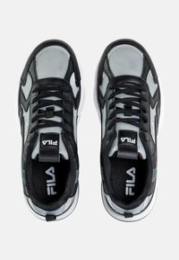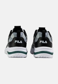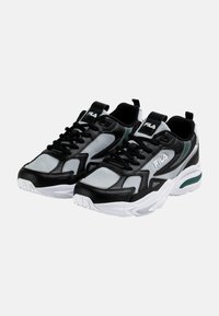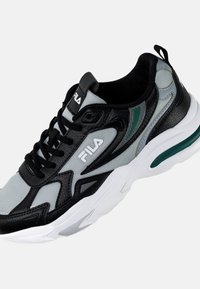 Czarno-szary sneaker z siateczkowym i sztucznym skórzanym materiałem, wyposażony w grubą białą podeszwę środkową, zielone akcenty oraz sznurowane zapięcie.
