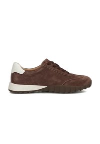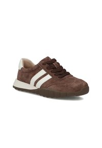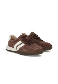 Brązowy zamszowy sneaker z białymi paskami, ciemnobrązowymi sznurówkami, białą zakładką na pięcie i teksturowaną podeszwą, widoczny z boku na białym tle.
