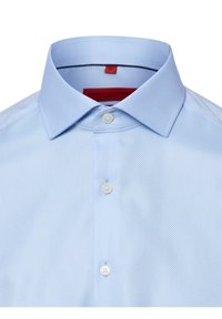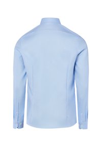Jasnoniebieska koszula z długim rękawem, zapinana na guziki z kołnierzykiem w szpic, pokazana na białym tle.