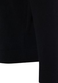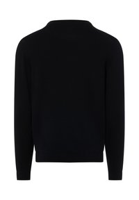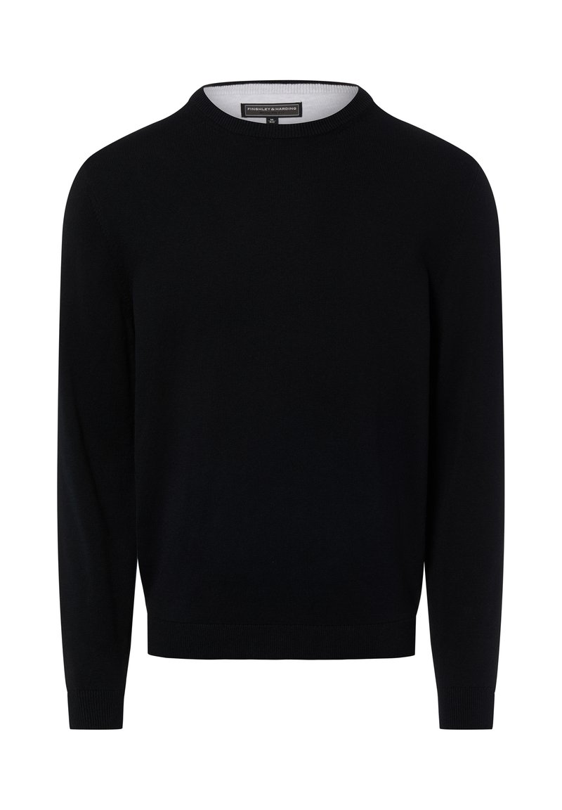Czarny dzianinowy sweter z okrągłym dekoltem, długimi rękawami, ściągaczami na mankietach i dole, z białym wewnętrznym kołnierzem. Klasyczny krój i prosty design.