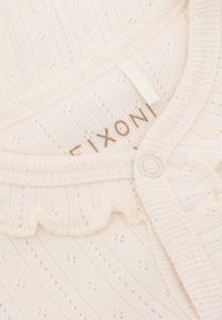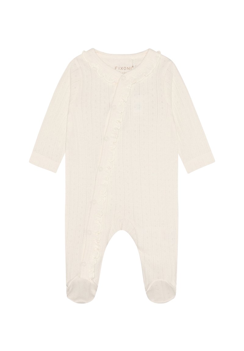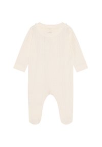 Kremowy śpioszek dla niemowląt z długim rękawem i stopkami, z teksturowanym wzorem dzianiny, falbanką oraz zatrzaskami od dekoltu aż do nogawki.