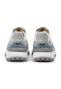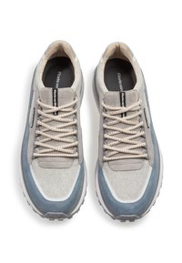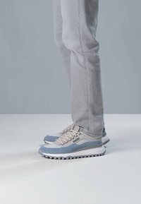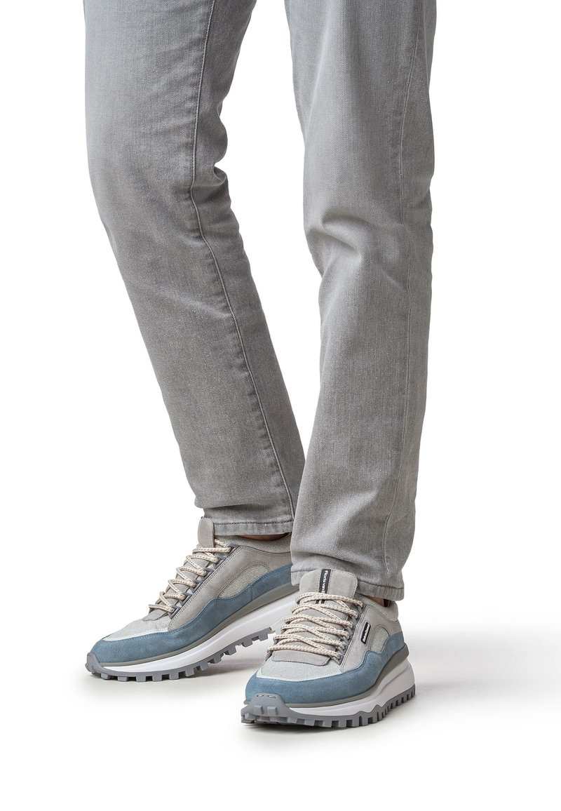 Szare dżinsowe spodnie w połączeniu z wielobarwnymi trampkami w jasnoszarym i niebieskim kolorze. Trampki mają teksturowane nakładki, grube sznurówki i wytrzymałe podeszwy.