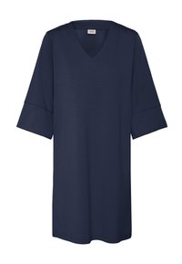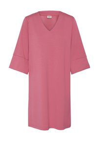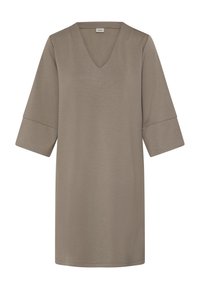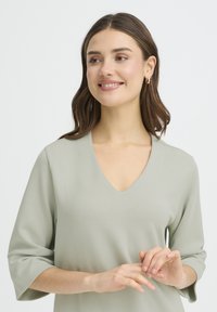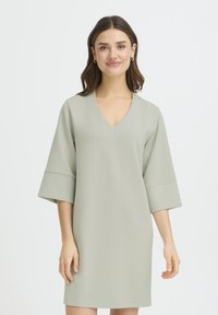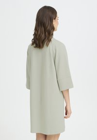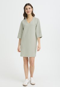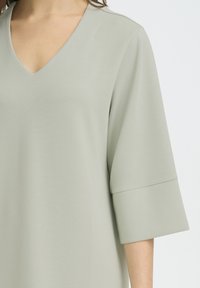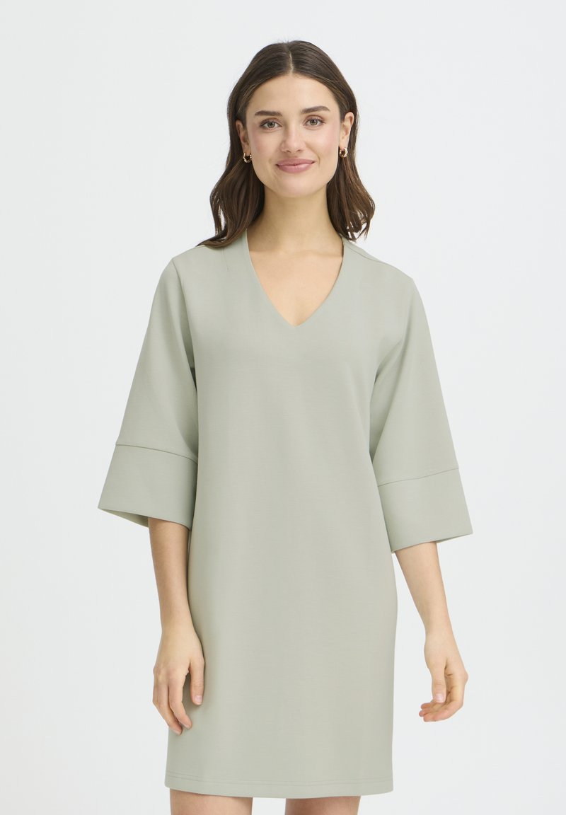 Jasnozielona sukienka z dekoltem w serek, szerokimi krótkimi rękawami i luźnym krojem. Wykonana z miękkiego materiału, o gładkiej fakturze, bez wzorów.