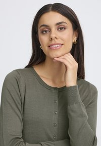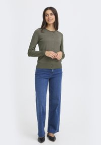 Młoda kobieta w oliwkowo zielonym rozpinanym kardiganie i niebieskich dżinsach, stojąca i uśmiechająca się na tle jednolitej białej ściany.