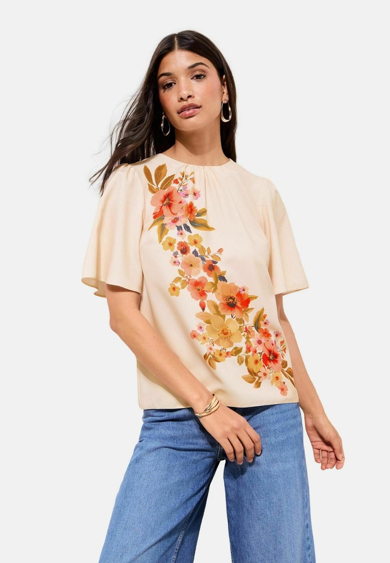 Kobieta o długich ciemnych włosach, ubrana w kremową bluzkę w pomarańczowo-żółty kwiatowy wzór z szerokimi, krótkimi rękawami, zestawioną z niebieskimi dżinsami.