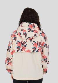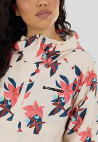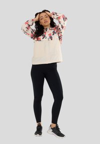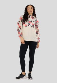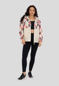Kobieta o kręconych ciemnych włosach, ubrana w białą kurtkę z różowo-niebieskim kwiatowym wzorem, stoi z założonymi rękami na tle w kolorze szarym.