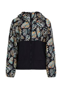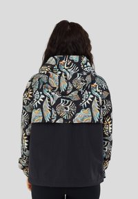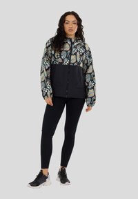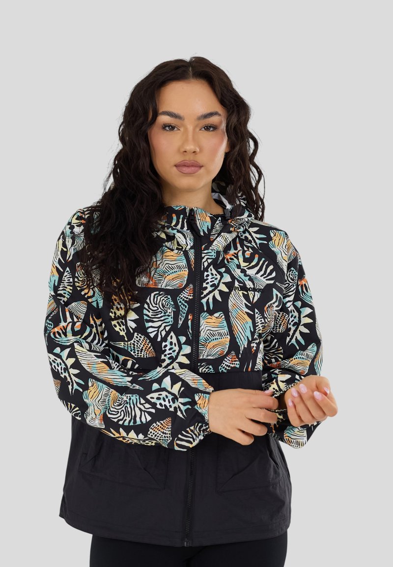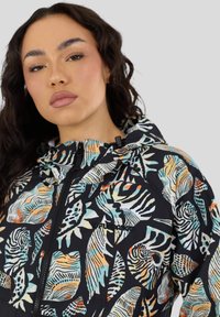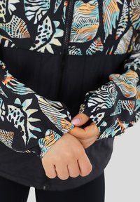 Kobieta poprawiająca rękaw czarnej kurtki z kolorowym, abstrakcyjnym nadrukiem liści i zwierząt, stojąca na tle jednolitego jasnoszarego tła.