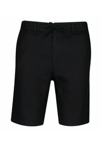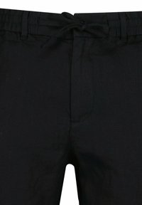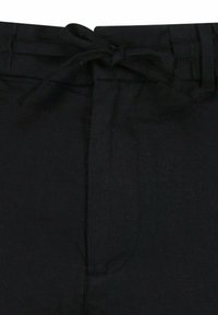 Czarne, luźne szorty z elastycznym pasem i sznurkiem, sięgające do kolan, o prostym kroju, bez widocznych kieszeni i wzorów.