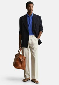 Mężczyzna w królewskim niebieskim polo i beżowych plisowanych spodniach, z srebrnym zegarkiem na nadgarstku, trzymający złożoną ciemną kurtkę.