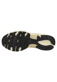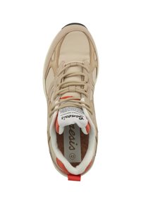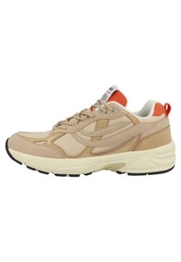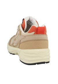 Beżowo-brązowy sneaker z białą podeszwą, pomarańczowym miękkim kołnierzem, sznurowanym zapięciem oraz czarnym bieżnikiem na spodzie.