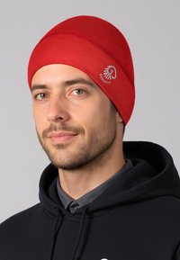 Czerwona dzianinowa czapka z gładką fakturą i białym logo po boku, noszona z czarną bluzą z kapturem.