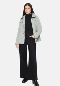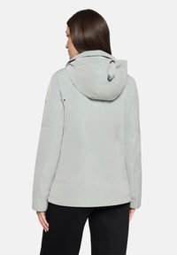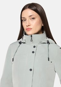 Jasnoszara wodoodporna kurtka z kołnierzem typu stójka, zapinana na guziki, z dwoma przednimi kieszeniami. Posiada kaptur ze ściągaczem i subtelną teksturę.