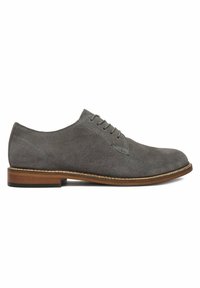 Szary zamszowy but wizytowy o spiczastym nosku, sznurowanym fasonie i subtelnych detalach przeszyć. Posiada drewniany obcas dla dodatkowego kontrastu.