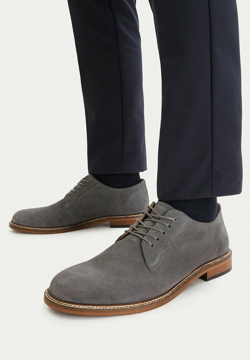 Mężczyzna ubrany w czarne spodnie i szare, zamszowe wizytowe buty sznurowane z brązowymi podeszwami, stojący na białym tle.