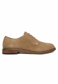 Beżowe zamszowe buty z wiązaniem, okrągłym noskiem i ciemnobrunatną podeszwą. Charakteryzują się gładką teksturą i minimalnymi detalami przeszycia.