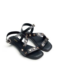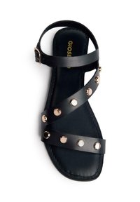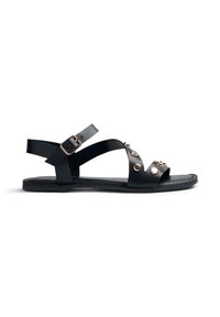 Czarna płaska sandała z paskiem wokół kostki, zapięciem na klamrę i metalowymi ćwiekami na przednich paskach na białym tle.