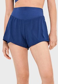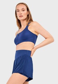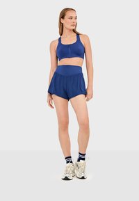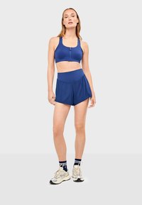 Granatowe sportowe krótkie spodenki z siateczki z szerokim pasem, luźnym krojem i zakończeniem z falbanką. Połączone z białymi skarpetami w granatowe paski oraz srebrnymi trampkami.